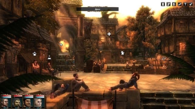 Так начинается наше путешествие по «неизвестному» государству. Мы ходим с приятелями по несчастью из города в город. Вместо прогулок по улицам наблюдаем статичные картинки безымянных площадей. Там мы можем запастись необходимыми вещами, перевязать раны у лекаря, восстановить силы в таверне или поискать новых неприятностей в виде побочных заданий. Просьбы могут смотреться вполне экстравагантно. Например, торговец умоляет убить своего злого брата-близнеца или два гнома предлагают поиграть со смертью. Но все это сопровождается, как и основная сюжетная линия, лишь скупыми комментариями. Единственным напоминанием, что прародителем Blackguards выступает настольная ролевая игра, служит вариативность диалогов, но и тут откровений нет. Все сводится лишь к выбору «да» или «нет», каких-либо сложных моральных дилемм задания не предоставляют.