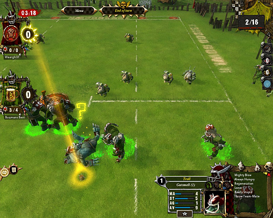 В цифровом варианте все организовано, как и в настольной игре: есть несколько рас, из представителей которых можно купить себе на весь стартовый капитал мощных защитников-лайнменов, нападающих-блитцеров, сообразительных разыгрывающих квотербеков, и ловких помощников-ресиверов с прямыми руками и ногами, способных и шипованный мяч поймать, и до конца поля добежать. Спортсмены обмениваются ударами, перепрыгивают подставленные подножки, пасуют друг другу и стараются побыстрее занести мяч в конец поля, чтобы команда получила очко, а игрок – возможность посмотреть забавный победный танец. Тактику для каждой игры диктует состав команды и способности отдельных игроков. Представители каждой расы обладают уникальными свойствами и умениями, позволяющими добиваться победы несколькими разными способами. Ключевые характеристики спортсменов – сила, ловкость, скорость, бронированность (Armor Value). Никто не ломал сложившиеся стереотипы, по естественным физиологическим причинам в фаворитах оказались орки, лизардмены, представители хаоса, люди и лесные эльфы. Брутальная агрессивность, неплохая скорость и бронированные панцири – зеленых парней, прямоходящих ящериц и минотавров чаще останавливают в шаге от победы не игроки противника, но собственная криворукость. Команда, неспособная поймать или поднять мяч, представляет собой душераздирающее зрелище. У людей и лесных эльфов все наоборот. Неплохие кулаки, ловкость, превосходная игра в пас и потрясающая скорость здорово компенсируют слабые оборонительные свойства. Эльфы легко догонят и завалят чужого игрока, стоящего в шаге от заветной последней линии. Дварфам бегать нет нужды, позиционную защиту с наскока не пробежишь. Потери гоблинов на футбольном поле уже давно вошли в поговорку – аутсайдеры вовсе не собираются вечно сидеть внизу турнирной таблицы. По ловкости и скорости зеленокожие кривляки равны скавенам и лишь немногим уступают эльфам, но, в отличие от хранителей лесных заповедников, способны лучше маневрировать и уходить с линии удара.