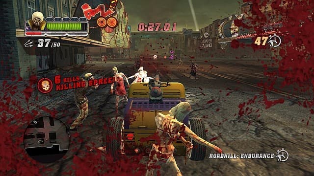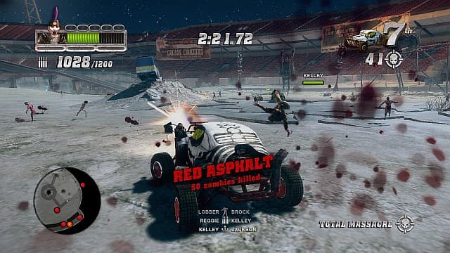 Сами же состязания первое время вселяют уверенность, что разработчики без шума и пыли выпустили отличную игру. По аренам носятся бешеные участники, их авто извергают «пьяные» ракеты (летят, куда захотят), огрызаются пулеметами, парят циркулярные пилы, под колёсами взрываются мины, кто-то активирует специальную возможность, и ошмётки тел зомби обильно орошают путь воина.