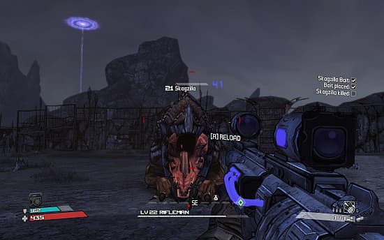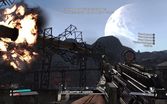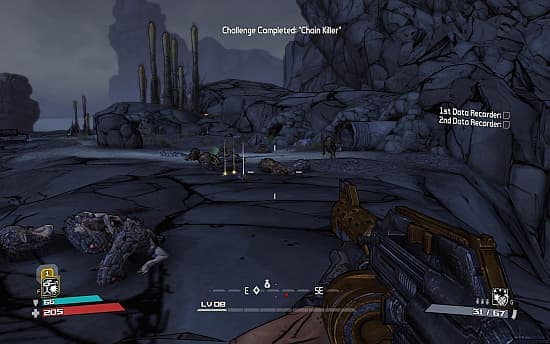 Однако способности являются лишь дополнением к главному средству борьбы за выживания – оружию. Разработчики не врали, что его тут «базиллионы». Они нарисовали сотни всевозможных деталей, а потом сотворили уникальный генератор, который налету из них собирает и раскрашивает новые пушки, подбрасывает их в сундуки и карманы бандитов. От такого дикого разнообразия глаза разбегаются. Причем, тут нет смешных или глупых моделей. Каждое оружие выглядит серьезным средством уничтожения живой плоти с соответствующей анимацией перезарядки, а не абстрактными футуристическими, простите, «пукалками». Но внешними отличиями дело не ограничивается. Из врагов, сундуков и даже куч мусора вываливаются серые, зеленые, синие, красные, оранжевые (цвет характеризует качество оружия) пистолеты, автоматы, узи, револьверы, гранатомёты, снайперские винтовки. У них есть три базовые характеристики: скорострельность, точность, убойная сила, а также самые мыслимые и немыслимые бонусы, вроде электрических или огненных атак. Точно также можно вешать модификаторы на гранаты, сильно меняя характер взрыва. Бомбы-липучки, ядовитые, поджигающие – выбирайте, вариантов множество. А вот брони в Borderlands нет, только самовосстанавливающийся энергетический щит, класс-мод (увеличивает характеристики героя), и артефакт (добавляет какой-нибудь бонус к специальной способности). Естественно, их разновидностей тоже валом. Конечно же, все старания разработчиков пошли бы прахом, если бы сам процесс отстрела злобных обитателей Пандоры был реализован плохо. Тут Gearbox не стала выпендриваться с новомодными идеями по «прилипанию» к укрытиям, а выдала нам классическую механику в стиле «Серьезного Сэма». Врагов много, они тупы, но они разные. В руках мощная пушка, выходим в зону контакта и начинаем пальбу с прыжками и перебежками. Дальних снимем снайперской винтовкой, любителей пообниматься встречаем залпом из дробовика в морду, мелочь расстреливаем из автоматов и закидываем гранатами. Тела разваливаются на куски и разбрызгивают декалитры крови. Гулко «ухают» дробовики, свирепо «тарахтят» пулеметы, новая обойма с металлическим лязгом входит в ложе, и потеха продолжается. Патроны не бесконечны, но исправно вываливаются из врагов и складируются в сундуках, ящиках, туалетных бачках и стиральных машинах. Поэтому дефицит ощущается только во время затянувшихся потасовок.