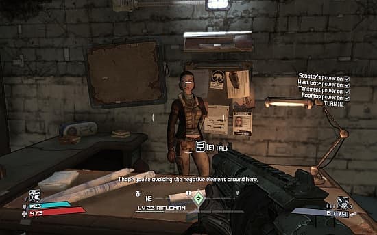 О том, что вновь прибывший не такой, как все, и, как минимум «избранный», говорит загадочная девушка с голубыми глазами, то и дело возникающая в углу экрана. За время приключения герой встретит самых разных личностей, но все «лихие повороты» рискуют остаться незамеченными. Максимум, на что способны персонажи – бесцельно бродить по своим хижинам. Многие и вовсе намертво прикручены к полу и стульям, не реагируя на выстрелы и попытки заговорить. Увидеть на их лицах некое подобие мимики – большая редкость. Сюжетные перипетии подаются в виде обыкновенного текста. Единственные доброжелательные обитатели Пандоры, которые выделяются на фоне людей-истуканов – потешные роботы. Эти малыши снуют под ногами, что-то бормочут, иногда шлёпаются на землю и, злобно ворча, поднимаются, чтобы продолжить развлекать публику. В общем, история тут воспринимается едва заметным шумовым фоном. Что-то есть, и ладно. Не в ней суть. Да и не нужна она тут. Правда финальный «пшик» все равно многих может сильно разочаровать: «Что это вообще было?!».Будут разочарованы и любители оригинальных поручений, поскольку работа, как правило, сводится к убийству, поиску и собирательству. Безжизненное население охапками раздаёт простейшие миссии и довольно премирует за них опытом, финансами и иногда даже крутыми пушками. Думать не надо, на радаре сразу помечается пункт назначения. Остается только туда добраться, учинить расправу и вернуться. Простая формула работает безотказно. Главное ведь в хорошем «дьяблоиде» не суть, а процесс. Прокачка, оружие, способности и мясо-мясо-мясо.