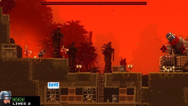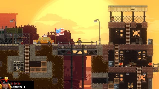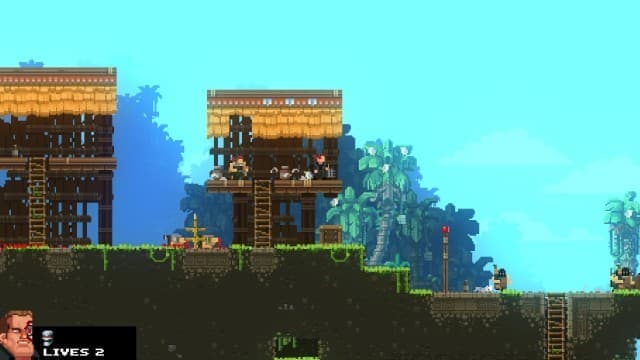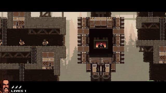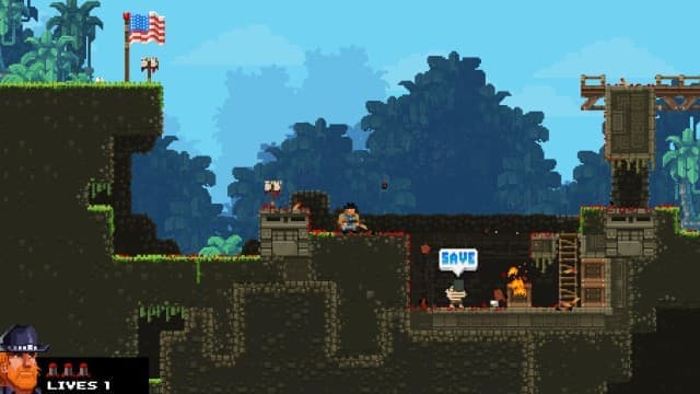 В Broforce не все герои открыты сразу. На локациях обнаруживаются клетки, где в заточении томятся бойцы. Если освободить указанное число пленников, то команда пополняется новым братаном. Спасение товарища дарует дополнительную жизнь, а заодно герой случайным образом меняет облик (замена происходит и после смерти). Да, тут нельзя выбрать любимого воина. Приходится довольствоваться тем, что дают, и подстраиваться под меняющиеся условия.