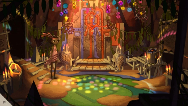 Великолепный визуальный стиль вкупе с маниакальной проработкой мелочей позволяет говорить о том, что в Double Fine не зря занимались проектом почти два года. Рука мастера чувствуется и в причудливых нарядах жителей рыбацкой деревушки, и в оформлении систем космического корабля, и при взгляде на убранство простого домика. То, как создатели используют знакомые мотивы (поселение над облаками) и переиначивают их на свой лад, заставляет искренне удивляться. Даже самое незначительное движение обитающих на заднем плане созданий анимировано. За счет чего декорации воспринимаются как живой мир.