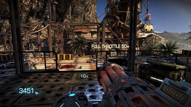 Другие идеи тоже вызывают массу вопросов. На кой в динамичном шутере от первого лица герою сделали столь массивное «тело»?! Грейсон то и дело цепляется за углы, ящики, въезжает на пятой точке в едва заметную корягу и получает болезненные уколы. Зачем в аркадном боевике, где нет нужды вести прицельный огонь, стрельба «с планки»?! Четрёхствольный дробовик в таком режиме выглядит смешно. Кому сдались напарники, неумело изображающие боевые действие и не реагирующие на стоящих у них под носом врагов?! Зато верные компаньоны охотно заслоняют линию огня, портят skillshot'ы и перекрывают дверные проёмы. И при этом в игре не предусмотрено кооперативное прохождение! Шутки – единственная польза от надоедливых соратников.Одиночная кампания в Bulletstorm непродолжительна – часов семь на максимальном уровне сложности. Учитывая обилие постановочных сцен и не самые лучшие сюжетные ходы, отправляться в повторное путешествие желания не возникает. Да и концовка в игре откровенно халтурная.Для тех, кто хочет покрасоваться мастерством, есть режим Echo. Здесь представлены кусочки уровней одиночной кампании. Игрок должен заработать как можно больше очков и не забывать про время. Чем лучше ваши показатели, тем выше позиции в рейтинге. Второй режим является типичной вариацией «Орды» из Gears of War 2 на четверых: люди против монстров. Забавное занятие портят неприятные проблемы: то с соединением проблемы, то игра уверена, что на пустой арене остались враги, и не пускает дальше. Подобные забавы быстро приедаются, но вскоре возникает желание повторить забег, чтобы покрошить мутантов из гипертрофированных пушек.