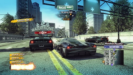 Почти каждый перекресток в Парадиз-сити является отправным пунктом к соревнованиям. К «гонкам» можно отнести только один тип – Races. Да и то с натяжкой. Во многом, опять же, из-за возможности самому определять путь к финишу, а также из-за стандартных особенностей сериала – оппоненты являются не столько соперниками, сколько врагами, которые делают все возможное, чтобы выбить игрока с трассы и вырваться вперед, оставляя того любоваться аварией с участием собственной машины. Поэтому мчимся на бешеной скорости по улицам города, лавируем между препятствиями, ловко срезаем путь на многочисленных улочках, тараним других гонщиков, обновляем в придорожных заправочных запасы бустера – вперед, к победе. А ведь соперники, жулики этакие, не успокаиваются. Если отстаешь – замедлятся, поморгают задними фарами. Если обгоняешь – ускорятся, не позволят оторваться. Таким образом, всегда находишься в сердце гонки, на острие драйва.