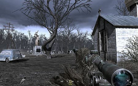Самое парадоксальное, что игру даже красивой не назовешь. В основном, нам придется прогуливаться по изъеденным войной арабским городкам и покинутым русским деревенькам без каких-либо особенных достопримечательностей. Да и графически Call of Duty 4 как-то совсем не впечатляет и скорее вызывает уныние. Всех поводов для гордости - эффект Depth of Field, включающийся во время прицеливания, да тени, отбрасываемые в реальном времени от всех объектов и только от одного источника света. А этим сейчас мало кого удивишь. Картинка чаще всего серая или коричневатая, благодаря специальным фильтрам, которые пытаются создать эффект выцвевшей кинохроники. Текстуры не отличаются четкостью и, тем более, не радуют рельефными поверхностями. Дизайн чаще всего строго функционален и на улицах помимо стен домов можно встретить только бочки, бетонные блоки и остовы машин. Но ведь цепляет, черт побери!