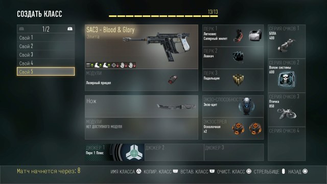 Помимо оружия и модулей, есть привычные перки и гранаты. Система создания собственного класса называется Pick 13 и во многом напоминает Pick 10 из Black Ops 2, то есть игрок может взять с собой 13 любых предметов. Особое место среди них занимают экзоспособности.