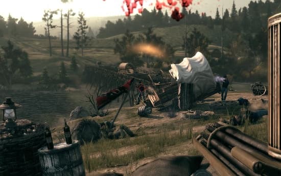 Враги в Bound in Blood не слишком интересны, зато многочисленны. Болванчики после появления, словно тараканы, разбегаются по углам и отрывают шквальный огонь. Они прут изо всех щелей, выпрыгивают из-за заборов, материализуются на крышах домов. С меткостью у них всё в полном порядке, поэтому приходится вертеться быстрее лисицы с подпаленным хвостом. Единственным недостатком в поведении бандитов является отсутствие давления с их стороны. Противники упорно не желают идти вперёд и позволяют спокойно «восстанавливать» здоровье, пригнувшись за кочкой.Для борьбы за выживание Макколлы используют винтовки и ружья. Конечно же, в их распоряжении находится и внушительный набор револьверов: от стандартных шестизарядников до декоративных дамских. Одни бьют больнее, другие перезаряжаются быстрее, третьи просто круто смотрятся. А ведь ещё есть возможность приобрести новехонькую пушку у торговца! Приятно после ржавого куска железа взять в руки сверкающий позолотой пистолет.Дуэли – неотъемлемая составляющая «Дикого Запада». В Bound in Blood данный момент реализован просто замечательно. Во-первых, нужно постоянно держать противника в поле зрения. Во-вторых, рука должна находиться как можно ближе к пистолету (контролируется при помощи стика/мышки). И в мгновение, когда прозвучит гонг, надо резко выхватить оружие (сдвинуть руку в сторону), и… на ногах останется только один. Необходимость одновременно следить за положением врага и собственной руки и напряжённое ожидание сигнала превращают такие схватки в захватывающее испытание.