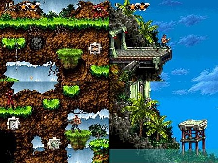 В рядах «врагов народа» обитает, как ни странно, и «двуликость» DS. Разработчики растянули игровую зону на два экрана. Плохо только то, что между самими экранами имеется зазор. И он здорово искажает траекторию пуль. В большинстве случаев это не смертельно. Помогает дизайн локация, условно разделенных на две половины. Но если уровень движется снизу вверх, то в «слепой зоне» вполне может оказаться и враг.