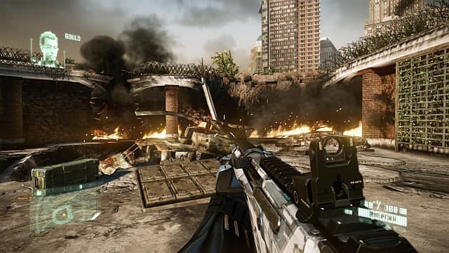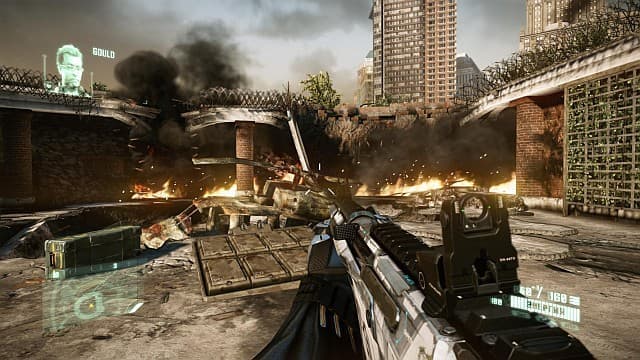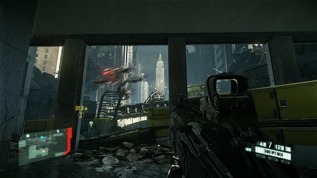 Проблемы с искусственным интеллектом у людей и чужих, общая линейность и навязчивые подсказки бросались бы в глаза не столь явно, если бы не однообразие. Герой шагает по городу и методично зачищает блокпосты. Потом выползают «кальмары», но подход «идём вперёд, всех убиваем или обходим стороной» остается неизменным. Игра периодически взрывается превосходной постановкой, но счастье быстро заканчивается, и снова приходится в режиме невидимости крутить фиги под носом у подслеповатых наемников или расстреливать мельтешащих, беспомощных врагов.Внешний вид Crysis 2 вызывает смешанные чувства. Ориентация на несколько платформ сказалась не только на уменьшении размеров уровней, но также на размазанных текстурах и упрощенных моделях. Недостатки детализации авторы компенсировали дурным количеством световых эффектов. Вскипающие взрывы, пробивающиеся сквозь обломки солнечные лучи, вспышки выстрелов, электрически разряды в дождливой ночи, пляшущие языки пламени смотрелись бы замечательно, если бы не желание разработчиков показать «крутую графику». Из-за постоянных вспышек, бликов, густых лучей и неестественно ярких отражений со временем жалеешь, что к игре не прилагаются специальные очки. Не 3D, а простые, солнцезащитные, чтобы глаза не уставали.На PC наблюдается интересный момент. Чем выше ставишь настройки графики (к слову, в меню это один параметр в три опции «низкая», «средняя», «высокая»), тем сильнее проявляется ядовитая мазня на экране. Картинка становится, так сказать, технологичнее, но отнюдь не красивее. Зато игра в самом деле отлично оптимизирована, шустро бегает даже на средних игровых компьютерах. Если ваша «машинка» справляется с играми на Unreal Engine 3, то и Crysis 2 запустится без проблем. Поддержки DirectX 11 нет, обещают добавить патчем.