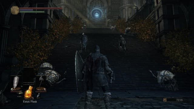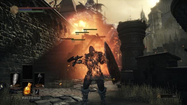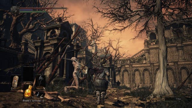 Применение оружейных навыков и заклинаний расходует запас концентрации (читай: маны). Восстановить его можно у костра или использовав пепельную флягу с эстусом. Да, в Dark Souls III два вида этих зелий. Один восстанавливает здоровье, а второй — ману. Тут есть одна особенность. Если в инвентаре помещается, например, четыре склянки, то герой волен взять три лечебных эстуса и один пепельный или по два каждого типа, или подобрать другое соотношение. Но не больше указанного количества. Общее число фляг с эстусом, как и их эффективность, увеличивается после нахождения соответствующих ресурсов.