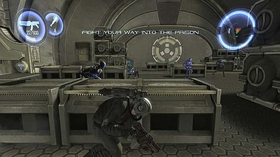 Несмотря на то, что профессия у нашего героя мирная, оружие в руках он держать умеет. Армия злобных пришельцев представляет собой роботов разных форм и размеров, одинаково глупых и самонадеянных. Они не в состоянии пользоваться укрытиями, обожают нервно метаться на открытом пространстве и испуганно приседать в чистом поле. Электроники даже с меткостью испытывают трудности, зато волшебный станок штампует их с невероятной скоростью, а главное достоинство противников – невероятная живучесть. Даже рядовой боец выдерживает пол обоймы в торс и пару попаданий в голову. В результате привычный подход высунулся-пальнул-спрятался превращает каждое столкновение в натуральную тягомотину. А вот от удара рукой в «лицо», ногой в «пах» или по стальной заднице гады отрубаются сразу. Но для этого к ним надо подойти поближе… В распоряжении героя есть реактивный ранец, позволяющий ему птицей парить над полем брани, забираться в труднодоступные места и искать различные методы устранения негодяев. Звучит заманчиво, теперь можно не просто бегать от одного ящика к другому, но залететь в тыл к неприятелям, атаковать с воздуха и со скоростью пули ретироваться в чистое небо. Архитектура многоуровневых арен открывает широкие просторы для творчества. К сожалению, подобные выверты используешь с целью привнести хоть некое подобие динамики в тоскливые бои, поскольку недруги не делают ничего, чтобы вынудить героя применять замысловатые приёмы. Они не оказывают совершенно никакого давления – мельтешат на расстоянии да постреливают в сторону Уилла.