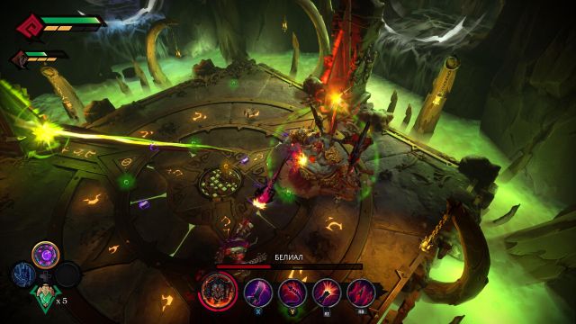 Смена перспективы на изометрическую не помешала разработчикам сделать крепкую боевую систему. Война рубит врагов мечом, комбинирует лёгкие и тяжёлые удары, а Раздор полагается на пистолеты с бесконечными патронами и помимо стандартных пуль стреляет аналогом энергетического луча или превращает оружие в своеобразную версию гранатомёта. Да, перед нами типичный тандем воина и лучника, но такой подход освежает уничтожение монстров. То ныряешь в толпу отродий и буквально вгрызаешься им в глотку, то отплясываешь на расстоянии. Прилагаются выдающиеся умения для каждого персонажа, включая призыв клона и таран.