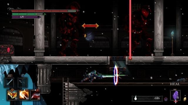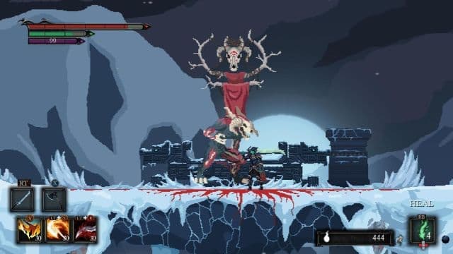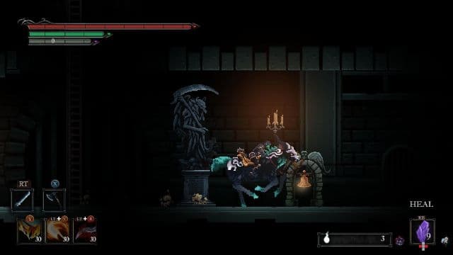 Примерно за полтора часа до финала девятичасовой кампании Death’s Gambit начинает давить суровыми испытаниями, а боссы свирепеют даже в обычном режиме. Всё замечательно? Нет! Этот отрезок такой же неоднородный, как и весь проект. То наслаждаешься преодолением хорошо выстроенных преград, то маешься с управлением в простых ситуациях, то погибаешь десяток-другой раз в сражении с чародеем, обладающим внушительным списком навыков, то бой растягивается необходимостью четыре раза убивать одного и того же монстра без ощутимых изменений. Ещё под занавес представления первого босса переводят в разряд обычных противников, а герой снова и снова сталкивается со знакомыми созданиями.