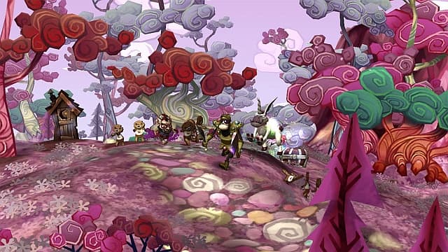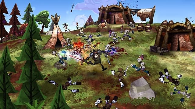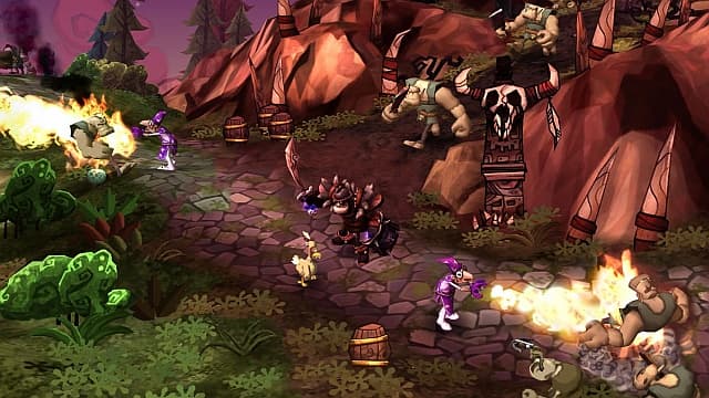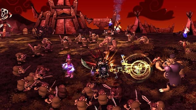 Поэтому рассматривать игровую механику DeathSpank нельзя в отрыве от сюжета. Без него - это простоватый клон Diablo, одиночная микро-версия World of Warcraft, где плечистый герой носится по бесшовному миру, в городах получает многочисленные задания и прет через поля-леса их выполнять, попутно сбивая головы их зубастым обитателям. Врагов много - и это хорошо. Трупы летят от каждого богатырского взмаха, пронзенные арбалетным болтом кувыркаются по земле. Какие-то противники коварно взрываются. Какие-то трусливо отбегают, чтобы пальнуть из луков. В любом случае они наваливаются толпами, заставляя безостановочно долбить по кнопкам, насылая на них громы и молнии, выбивая последние мозги молотом и отсекая ненужные конечности сабелькой. Или джедайско-подобным шворцем, издающим при каждом взмахе характерные гудящие звуки. Из поверженных тел вываливаются золото, броня, оружие и склянки с зельями. Растут уровни, открывается доступ в новые локации, заселенные толстопузыми ребятами. Некоторые из монстров способны пришлепнуть DeathSpank'а одним ударом, приходится вовремя выставлять щит. Исследуем подземелья, сражаемся с боссами, в финале, понятное дело, спасаем мир от сил Зла и находим артефакт с незатейливым названием Артефакт. На все про все - 10 часов.