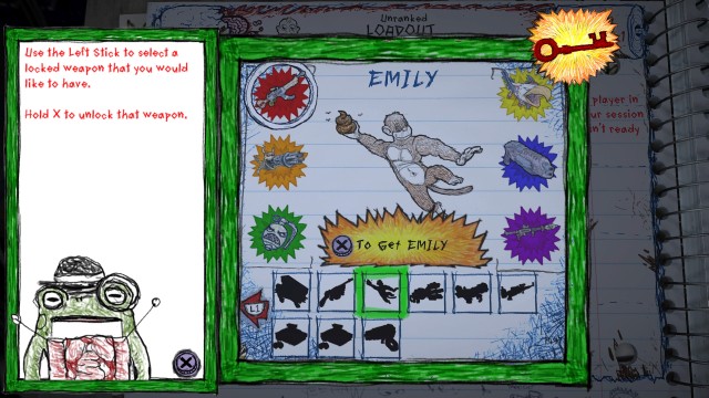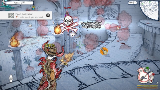 К аренам вообще стоит внимательно присмотреться. Забавных элементов, обильно сдобренных чёрно-чёрным юмором, в них полно. У подобной рисовки есть лишь один недостаток — функциональный. В мешанине тонких линий сложно что-либо рассмотреть на большом расстоянии. Создатели этого хорошо понимали, поэтому в игре много ярких пиктограмм, указывающих на местонахождение противника и тип лежащего вдалеке оружия.