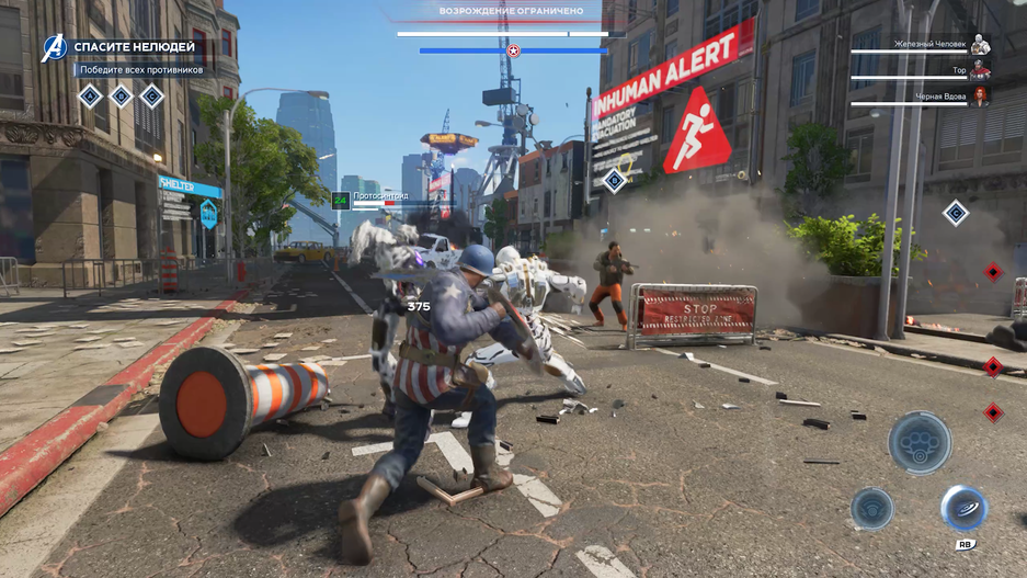 Герои пытаются быть уникальными, но именно что пытаются. Удары могучего Халка, дрожание экрана и истеричные вибрации геймпада не делают его сколько-нибудь сильнее Чёрной вдовы. Он — не танк. Она – не ловкий боец дальнего боя. Они оба равны, просто анимации и суперприёмы немного отличаются, плюс атаки дальнего боя и способ передвижения по уровням. Халк высоко прыгает, а Вдова использует крюк-кошку, чтобы запрыгивать на крыши и притягиваться к врагам. Аналогично Капитан Америка и Мисси Марвел. Тор и Железный человек могут летать, из-за чего иногда кажется, что снова вернулся в Anthem. В его ухудшенную версию.
