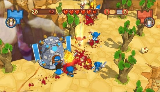 Бои тут быстрые, веселые и массовые. Управлять подконтрольным солдатом весьма просто: можно атаковать как избранного противника, так и молотить сразу по площади, копить силу удара, мгновенно переключаться на другое оружие. Если ранили – ничего страшного. Достаточно отбежать в тенек, присесть на пару секунд, сжевать бутерброд – здоровье само восстановится. Конечно, это если рядом нет лекаря. Тот позволяет воевать безостановочно, устилая землю телами врагов и украшая зеленую травку красно-малиновыми плямбами. Игра может и выглядит по-детски, но насилием тут занимаются со знанием дела: с кровопусканием, расчленением и дикими визгами. Одиночная кампания в таких условиях – только тренировка основам на семи картах с вышеизложенной «интригой». Боты работают по одной программе, хитростям не обучены, поэтому историю пролетаешь с одной лишь целью: получить заветный трофей в награду и навеки забыть о ее существовании.Еще одно развлечение – «Арена», где избранным классом, в одиночку, приходится рубить, жечь или расстреливать толпы противников. Занятие увлекательное само по себе, но без ролевой системы, характерной для Crimsonland и последователей, вряд ли затянет больше, чем на десяток раундов.