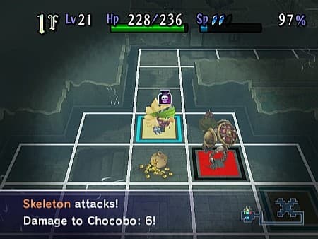 Здесь на каждое действие игрока есть четкая реакция окружающих монстров. Сделал шаг – противник сделал шаг. Ударил – получил в ответ. Попытаешься сбежать – сзади добавят. Вся тактика заключается в быстрой победе, выбирая безопасную дистанцию атаки и силу ударов, прикрывая фланги и тыл стенами узких коридоров и обнаруженными ловушками. Побродить по локации, чтобы восстановить здоровье и магическую энергию, получается не всегда: монстры педантично патрулируют территорию и регулярно устраивают засады. Кроме того, чокобо не чуждо чувство голода, которое очень скоро подскажет, что пора подкрепить потраченные на прогулку силы.
