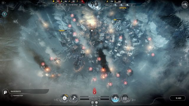 Как и в любой «выживалке», ключом к успеху является грамотное управление ресурсами. Уголь важен для поддержания тепла, источаемого генератором. Древесина и сталь позволяют возводить новые здания и являются сырьём технологического прогресса. Сырая пища на кухнях превращается в пайки и утоляет голод. Помимо материальных ресурсов, мы должны управлять уровнями «Недовольства» и «Надежды» общества. Ваш город — перманентно умирающий организм, нуждающийся в реанимации.