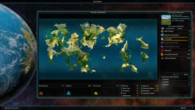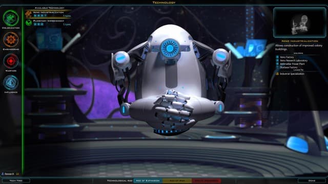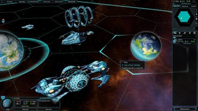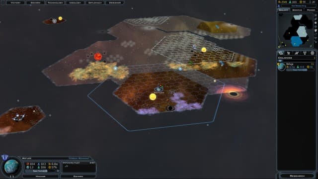 Существенным изменениям подверглась система развития колоний. В прошлых частях у каждой планеты был рейтинг, определяющий, какое количество улучшений вы могли построить. В новой части на гексагональной карте вы должны создавать максимально эффективные цепочки строений, поскольку они влияют друг на друга. Кроме того, здания влияют на прирост населения, денег, очков науки или добычу ископаемых. Некоторые сооружения можно возводить только на определенных планетах.
