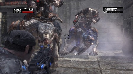 Но самым большим бонусом для поклонников кооперативных баталий стал режим «Орда» (Horde). Эта реинкарнация древнего Invasion для Unreal Tournament 2004 заставляет группу до пяти славных бойцов COG сражаться на избранной арене, отбиваясь от толп прущих со всех сторон противников. И вот тут, именно тут просыпается дух старого Gears of War. Epic хорошо поработала над искусственным интеллектом локустов, и в онлайне они совсем не напоминают тех скриптованных болванчиков, массы которых в кампании тупо дохнут под градом снарядов из мортир. О нет. Они маневрируют, они пользуются укрытиями, не идут в лоб, отходят, терпеливо сидят в засадах, окружают. И самое главное – на игроков вбрасывают сразу все возможные виды врагов: от шустрых камикадзе и снайперов до бугаев с дубинами и тесаками. Схватка накаляется, одна волна сходит, начинается другая, уровни захламляются мясом, вопли «Прикрой», «Отходи», «Спасите! Помогите!» льются в эфир, и кровь легко вскипает на адреналиновом топливе.