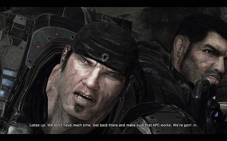 Gears of War является, помимо прочего, еще и командным шутером с легким элементом тактики. Маркус ни на секунду не расстается со своим другом Домиником (Dom), а иногда к ним присоединяются еще пара коллег не менее суровой наружности. Все парни, как на подбор. Налитые мышцы, обветренные лица, волевые подбородки, низкие лбы. На таких мужиках массивная броня смотрится также естественно, как на черепахе панцирь. Такое ощущение, что военные в мире Сэра принадлежат к какому-то отдельному, генетически выведенному сословию. Рядом с ними мощные солдаты Саранчи смотрятся уродливыми братьями, а щуплое и хилое человечество, что трусливо попряталось в убежищах и довольствуется крысами на обед - другим видом.