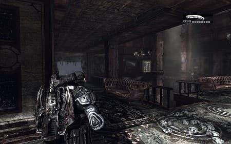Чтобы не мешать погружению в мир Сэры, в Gears of War почти полностью отсутствует интерфейс. Обычно на экране нет никаких обозначений, да и те включаются только во время перестрелок в виде прицела и счетчика патронов. Подобная особенность здорово повышает кинематографичность происходящего, особенно во время бега, когда камера начинает трястись, словно невидимый оператор со всех ног припускает за Маркусом. Как будто фильм смотришь.