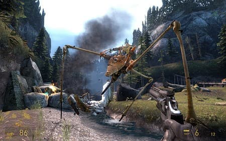 Главным приобретением Episode Two является улучшенный фонарик Гордона Фримана, который теперь умеет светить, а не только освещать. От предметов отбрасываются динамические, приятные, мягкие тени, поэтому прогулки по глухим пещерам и подземельям смотрятся гораздо живее, чем было раньше. Дополнительно увеличили емкость батарей, которые расходуются отдельно от энергии оранжевого костюма. Данные нововведения сделаны не от простой жизни. Несмотря на уверения разработчиков и пасторальные пейзажи на дорелизных скриншотах, в катакомбах предстоит провести много времени, отбиваясь от зомби, муравьиных львов, комбайнов и даже от нового вида противников - Охотников. Да-да, Episode Two подкидывает нам миниатюрную и очень злую модификацию трехногого великана-страйдера. Быстрые, живучие, опасные при близком контакте и на расстоянии – эти твари хорошо умеют портить жизнь, особенно при поддержке комбайнов.