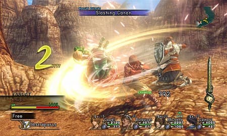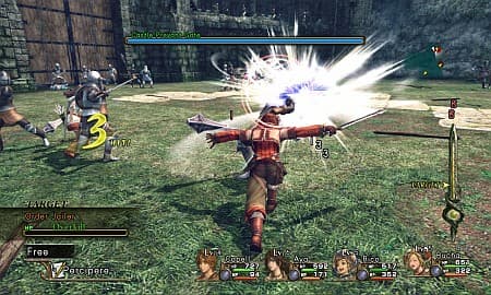 Цитата:Боевая система — фундамент любой хорошей японской ролевой игры. Вместе с Капеллом на поле брани может быть ещё три товарища. Поскольку все схватки происходят исключительно в реальном времени, соратники находятся под контролем искусственного интеллекта и в целом ведут себя адекватно, чётко следуя одной из заданных им тактик: Combo (сосредотачиваются на цели Капелла для совместных атак), Focus (атакуют ту же цель что и герой), Spread (атакуют другие цели), Free (каждый действует сам по себе), Save MP (не используют магию). Сам же вояка тоже принимает активное участие в потасовке. Кроме двух ударов (естественно, имеются их комбинации) и набора особо сильных подач Капелл может «связываться» с однополчанами и выполнять другие специальные приёмы. К примеру, связавшись с Айей можно воспользоваться её луком. И, если учесть немалое число компаньонов, то, на первый взгляд, открываются широкие просторы для разнообразных способов устранения супостатов.