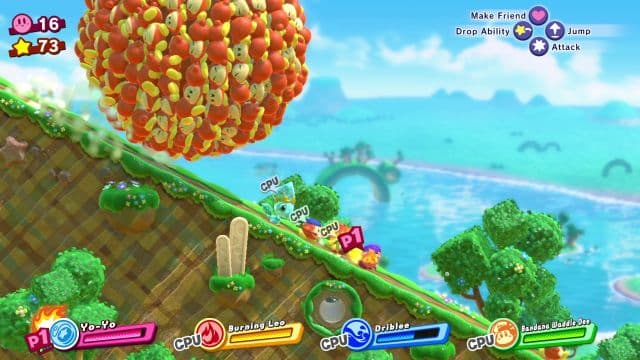 Само собой, предусмотрен кооператив на четверых, правда только локальный. Зато присоединиться к игре можно в любой момент, достаточно дать товарищу джойкон. Для подключения ещё двоих пользователей нужны дополнительные контроллеры. Есть повод говорить о том, что отсутствие совместного прохождения по сети — непростительное упущение в современных реалиях. Однако это скорее красноречивое подтверждение того, что Kirby Star Allies рассчитана на шумную компанию.