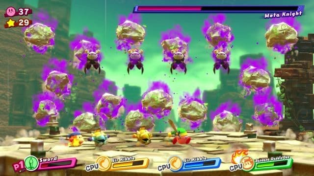 Теперь Кибри не только проглатывает противников с целью перенять их навыки, но и превращает их в товарищей. Достаточно бросить во врага сердечко, и он сразу же присоединяется к отряду в составе до четырёх персонажей. В команду с радостью вступают рыцари, обладатели магических способностей, боевые художники, повара, а также местный аналог Бомбермена или Человека-паука.