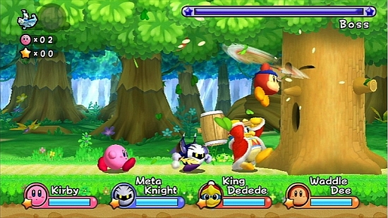 Несмотря на отлично построенные уровни, с множеством самых непредсказуемых препятствий и оригинальных испытаний Kirby’s Adventure Wii – игра неприлично лёгкая, по крайней мере во время первого прохождения. Первые пять миров проходятся на одном дыхании, и погибнуть можно лишь по собственной глупости, нежели по причине суровых обстоятельств. Оставшаяся часть приключения хоть и поднимает планку сложности повыше, но по причине скоротечности не позволяет ощутить все невзгоды в полной мере.С другой стороны проект силён не только основной частью приключений, но секретами и дополнительными занятиями. После первого прохождения открывается новый уровень сложности, где герой лишается значительной части «здоровья». Приходится выверять каждое движение, забыть о принципе «главное посмотреть и попробовать» и применять способности Кирби с умом.Немаловажно, за деталями для космического корабля дозволено отправиться сразу четырём героям. На выбор представлено три антагониста вселенной. Они не умеют копировать способности других, но молот, меч или копьё могут пригодиться. Персонажи умеют объединять свои возможности, помогают друг другу и обрушивают на неприятелей комбинированные атаки. В семейное веселье вклиниваются странные решения разработчиков. «Жизни» - общие на всех, причём присоединившиеся персонажи возрождаются сразу. А вот гибель «главного» означает переигровку с контрольной точки. В результате игра больше походит на фентезийный режим V.I.P. – один герой пытается избежать неприятности, в то время как другие следят за его сохранностью.