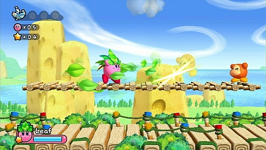 Приспособлениями получается резать верёвки и открывать себе дорогу в недоступные участки уровня, быстро передвигаться или без боязни бросаться на целую ораву озлобленных монстров. Кирби меняет облик с невероятной частотой: превращается в камень и проламывает хрупкие перекрытия, орудует волшебной палочкой и разбрасывается бомбами в разные стороны. Метаморфозы не только полезны и необходимы для достижения результата. Пользоваться, находить всё новые и новые способы применения многочисленным обликам Кирби легко, просто и весело. При этом список приёмов растягивается, и игра в отдельных сценах напоминает чуть ли не файтинг, пускай и незамысловатый.Основа осталась нетронутой. Герой скачет по платформам, не забывает о том, что он ещё летать умеет, и спешит к заветной цели. Вселенная полна самых разных преград и испытаний. Перед Kирби возникают бездонные пропасти, некоторые разновидности недругов вредны даже для его желудка. Отважный спаситель попадает в кромешную тьму и вынужден искать свечку для освещения пути. Иногда он должен донести ключ до закрытой двери. При всём невероятном многообразии обличий героя никогда не оставляют в тупике и не заставляют долго искать определённый образ. Если для продвижения дальше в обязательном порядке необходима конкретная вещь, то Кирби её получает без вопросов.Локации имеют привычку перестраиваться в самый неожиданный момент. Действо то и дело разбавляется мини-боссами, которые значительно сильнее и опаснее рядовых противников, их не получится уничтожить за парочку плевков или ударов.В отдельных ситуациях в распоряжение Кирби попадают оружие и способности с приставкой «супер». Тут уж на экране начинает твориться форменный беспредел вперемешку с апокалипсисом. Герой вызывает огненных драконов, разрушает добрую половину уровня одним взмахом гигантской сабли, превращается в огромный снежный ком и мчится напролом, сметая всех и вся на своём пути. Отличный повод расслабиться и насладиться красочным шоу.