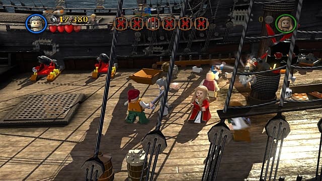 Также в сюжетных сценках нет и намека на пародию. Просто повторение того же, только с участием неповоротливых пластиковых человечков. Место классического юмора и веселья тут занимает нездоровая тяга действующих лиц к фруктам и свиньям. Последние мелькают в кадре на протяжении всей игры по поводу и без.Лишившись одной традиционной для франчайза составляющей, LEGO Pirates of The Caribbean сохранили до вывиха челюсти знакомый игровой процесс. Отважная команда героев исследует локации, разбивает на мелкие куски окружение и набивает карманы «колечками». По-прежнему в ходу принцип разделения труда, и каждый персонаж наделён уникальной способностью. Джек Воробей достаёт из кармана свой легендарный компас и отыскивает важные вещи. Мистер Гиббс ремонтирует поломанную технику. Уилл Тёрнер умеет швырять топоры. Его отец наделён даром перемещаться там, где другие застрянут навеки. Накачанные матросы перетаскивают тяжёлые ящики. Девушки, как обычно, выше всех прыгают.На таком нехитром распределении обязанностей и строятся местные головоломки. Найти полезную вещь, применить возможность того или иного героя и добраться до заветной цели. Задачки либо любезно подсвечиваются, либо совершенно очевидны, либо (согласно печальным заветам сериала) решаются сами собой методом перебора способностей подопечных.