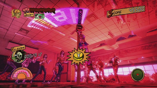 Кроме бензопилы в арсенале героини есть некий вариант гранатомета. Но стрельба тут реализована не лучше, чем ближний бой. Всему виной неадекватная система автоприцеливания, которая не позволяет точно выбирать врагов и объекты, скачет, куда попало, отказывается переключаться на другого зомби. И вместо того, чтобы скрыть недостатки, авторы принялись их выпячивать. Джульетт то должна расстреливать зомби и защищать автобус. То вдруг заставляют убивать всех врагов за ограниченное время, проклиная неугомонных мертвецов, голубоглазых блондинок и японских гейм-дизайнеров. И все же отправлять Lollipop Chainsaw в группу неудачников нельзя. В первую очередь благодаря стилистике: зомби-апокалипсис глазами нимфетки. Из монстров хлещет не кровь, а розовое конфетти, валентинки и монетки. Бензопила украшена сердечками. Камера буквально облизывает формы девушки, а ее некоторые особо откровенные наряды не оставляют простора для фантазии. В игре есть по-хорошему сумасбродные отрезки. Джульетт играет в баскетбол с мертвецами, сельскохозяйственная техника используется не по прямому назначению, не обошлось и без трибьюта проектам 8-битных времён с «квадратной» графикой. Боссы качественно отличаются от своих безликих подчинённых. Каждый из них представляет собой определенный музыкальный стиль: от панк-рока и хэви-метал до фанка и рок-н-ролла. Битвы состоят из нескольких этапов, противники обретают новые способности, а старые приёмы начинают бить ещё больнее. Приходится менять тактику, подстраиваться под новые условия. Кроме Джульетт и её двинутых оппонентов любоваться в Lollipop Chainsaw особо нечем. Обидно, что сумасбродную стилистку засунули в столь невзрачную обёртку. Где бы героиня не оказалась - в школе, на стройке или ферме - везде ее окружают унылые коридоры и пустые площадки, отличающиеся друг от друга разве что цветом. Локации небольшие, а загрузки долгие, что еще сильнее обескураживает.