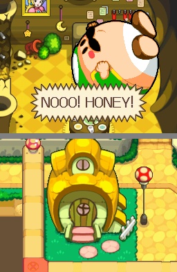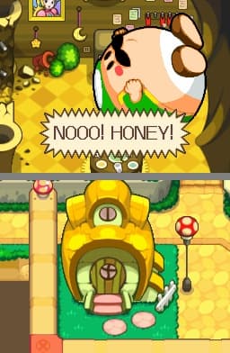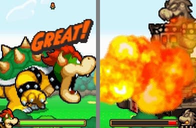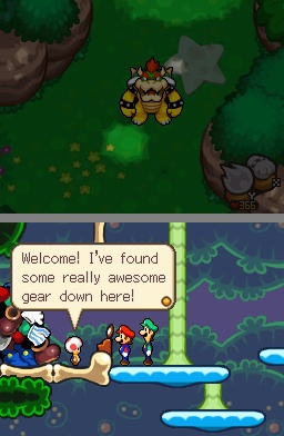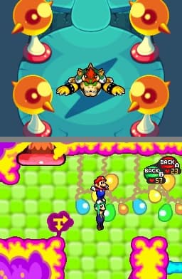 Боузер, Марио и Луиджи гуляют каждый по своему экрану – один вверху и двое внизу. В драке часто объединяют усилия, но каждый остается на своем месте, редко-редко меняясь ролями. Братья-водопроводчики сидят внутри, король действует снаружи: выжигает огнем, лупит кулаками и засасывает тех противников, что послабее, а братья эстетствуют – точно прыгают сверху, аккуратно лупят молотками и постоянно норовят устроить форменный цирк-шапито с акробатами, клоунами и фокусниками. В представлении активно участвуют и монстры: куски мяса, сундуки с золотом, трухлявые пни, червяки и паразиты, зубные змеи, соты с медом, угольные печки, ящерицы-переростки. У каждого противника всего по две атаки, опасность от которых можно свести к нулю, но дело не в обмене ударами, а в общей атмосфере веселья. Особенно, когда Боузер применяет свою новую способность по всасыванию всего и вся. После одного мощного вдоха чужие челюсти, мелкие монстры и лекарства оказываются в ненасытной утробе, где дело завершают Марио и Луиджи. В отдельных случаях у игрока это единственная тактика – отобрать у противника его оружие или исключить из борьбы полезных помощников. Освоим нехитрый прием и других проблем в сражениях не будет. Знай, набирай себе опыт и прокачивай характеристики.В дороге персонажи часто меняются ролями, как будто передавая эстафетную палочку. Марио и Луиджи уперлись в перегородку или не видят пути дальше? Боузер топает к фонтану или к аппарату рентгена. Вода поднимет заслонку, а с помощью техники в особо темных местах кишечника будет чуть светлее. У короля не хватает огня, отсутствует сила в мышцах, болит живот от переедания, сводит нос от аллергии или вообще наблюдается полный упадок сил? Итальянцы накачивают мускулы энергией, разбивают непрожеванные куски, чистят нос от спор и собирают адреналин по крупицам, чтобы союзник продолжал совершать новые подвиги!