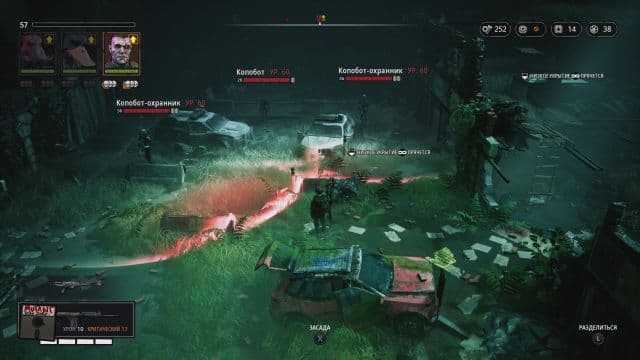 Персонажи подкрадываются к врагам поближе, чтобы изучить маршруты патрульных и оценить уровень опасности. Можно расставить сталкеров в удобные позиции и потом атаковать противников. Нападение из засады с применением оружия с глушителем позволяет разобраться с часовым и не привлечь внимание безумных сектантов.