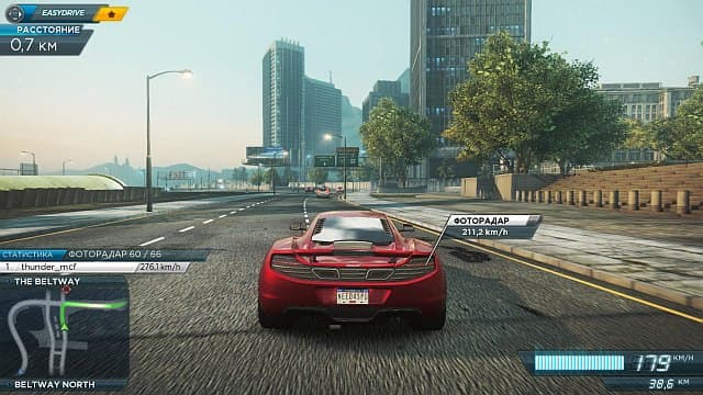 В кольцевых гонках, а также заездах из одной точки в другую отсутствуют невидимые стены, огораживающие трассу, и стрелки-указатели, намекающие на дальнейший маршрут, встречаются крайне редко. Вроде бы все как в Burnout: Paradise, где игрок пользовался всеми особенностями открытого мира и выбирал путь к финишу без всяких ограничений. Но в Most Wanted для успеха надо обязательно проезжать контрольные точки. Из-за этого приходится постоянно коситься на мини-карту и нервничать, поскольку пропущенный поворот может обернуться потерей лидерства и проигрышем. К срезкам и объездам начинаешь относиться с опаской – мало ли, вдруг не туда. Дополнительные трудности создает расположение камеры. Авторы предусмотрели всего два положения, с бампера и низко-сзади, так что сложно оценивать расстояние до столбов и поворотов.