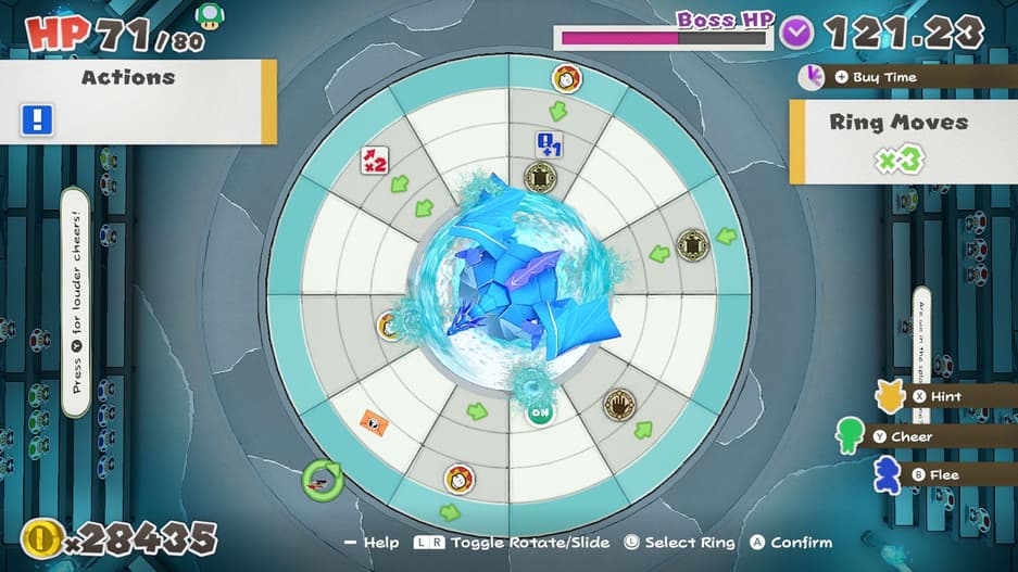 От заявлений о бессмысленности боевой части проект спасают боссы, тоже выполненные в формате головоломок. Тут уже злодей находится в центре арены, а Марио выстраивает к нему правильный маршрут. Для активации магических атак или для удара противника в слабое место нужно пробежаться по конкретным «клеткам» и оказаться в конкретной точке в финале пути. Сделать это бывает непросто, когда и таймер тикает, и идеального варианта не видишь. На мозг давит и осознание того, что за ошибку больно наказывают.