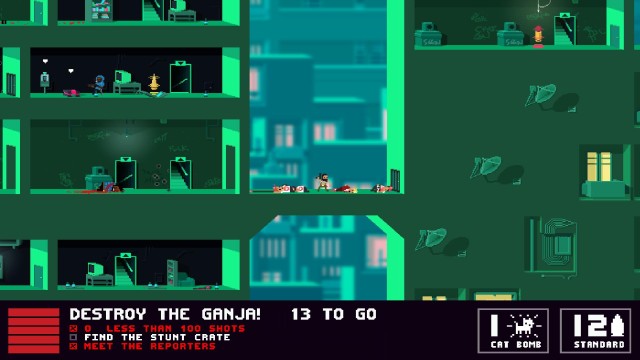 Миссии сопровождаются «пиксельной» жестокостью и показушными казнями. Попутно герою выдают три дополнительных задания. Его просят собрать указанные предметы, добраться до финиша за определенное время, выполнить какие-нибудь трюки. Чем больше поручений удалось завершить, тем выше итоговый рейтинг. С повышением этого показателя пополняется команда кролика.