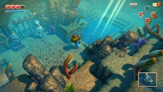 Сухопутная часть не такая элементарная, как морская. Мальчуган, прямо как его дальний родственник Линк, изучает окрестности, обнаруживает сундучки с ключами, открывает закрытые двери, активирует древние механизмы, разбирается с противниками и пробирается в подземелья, где его поджидают боссы. Однако игра отличается удручающей простотой.