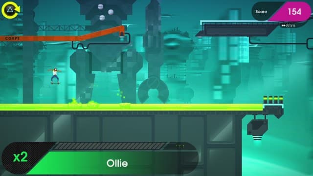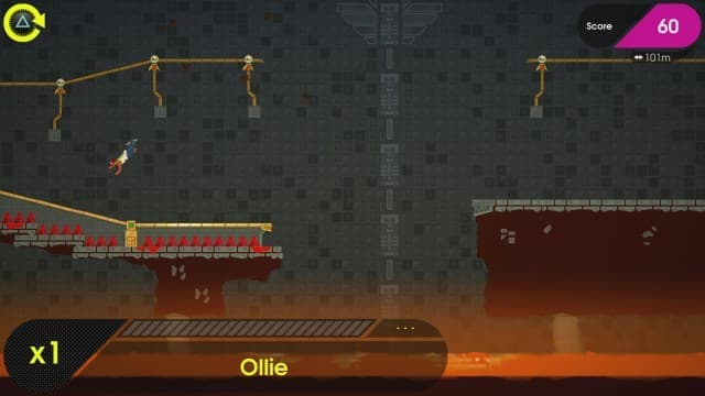 Однако для успешной посадки надо нажать кнопку непосредственно перед приземлением. Чем ближе к земле находится герой в момент нажатия, тем «мягче» посадка и, соответственно, тем больше баллов оседает на виртуальном счету. В результате неудачного приземления на мгновение теряется контроль над протагонистом, а скорость его движения замедляется. В большинстве ситуаций это означает падение и повторение заезда с самого начала. Препятствия тут выстроены настолько плотно, что права на ошибку у скейтера зачастую нет.