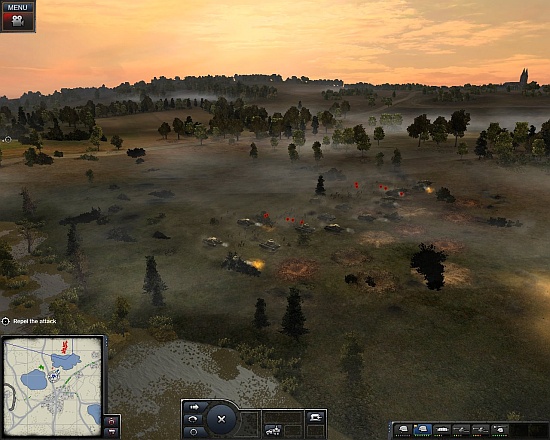 Американцам такого звериного отчаяния не перепало, но это не означает, что наступление на Западном фронте напоминает туристическую поездку во Францию. Янки отправляются в опасный ночной десант и на самоубийственный штурм Омахи-бич, бросаются в жестокую драку с бронированными «пантерами» подле туманного Арракурта и рвутся спасать окруженных товарищей из пасти тяжелых «тигров», устраивают ловушки для отступающих немцев и сами оказываются в смертельных капканах. Сражениям не хватает только большей взаимосвязи. Одни и те же события можно было бы представить с точки зрения разных воюющих армий. Впрочем, в «скирмише» можно переиграть несколько сценариев, используя воинские части другой армии. Первая задача, вроде защиты позиций или атаки войск противника, которую командование ставит перед игроком – это лишь маленькая прелюдия к большой симфонии, которую будут играть два военных оркестра. На карте сценария расположены несколько контрольных точек, захват и удержание таких позиций приносит в копилку игрока небольшую сумму абстрактных ресурсов, необходимых для вызова подкреплений. Кроме притока дополнительных сил захват стратегических высот, лесных лагерей и городков открывает доступ к новым видам солдат и техники, а также деблокирует ближайшую дорогу, то есть свежие силы будут прибывать на поле боя намного быстрее, позволяя сначала закрепить промежуточные успехи или окончательно переломить ход сражения в свою пользу. К активным действиям игрока будут подталкивать все те же приказы вышестоящего начальства, заставляющие постепенно разбираться и брать под свой контроль сначала маленькие кусочки, а затем всю карту целиком. К этому времени количество войск уже будет соответствовать масштабу, так что заканчивать сражение будет не маленький ударный отряд, но добрая сотня единиц бронетехники и почти тысяча солдат, объединенных под рукой командира.На полях сражений достаточно места, чтобы применить умения всех родов войск, поэтому не совершайте ошибку, которую допускают игроки, воспитанные на современных «тактических» стратегиях, – не бросайте армию одной бесформенной кучей на врага. За такое неуважение Марс отомстит сумасшедшими потерями. Единичной лобовой атакой в игре практически ничего нельзя достигнуть. Тем более, что после первого штурма придется сделать второй, третий и четвертый, выдержать пару встречных контратак и побороться за безопасность тыловых зон. Наступать необходимо как минимум по двум направлениям, тормошить позиции противника авиацией и дальнобойными гаубицами, взламывать оборону одновременными ударами или чередой атак с небольшим опережением.