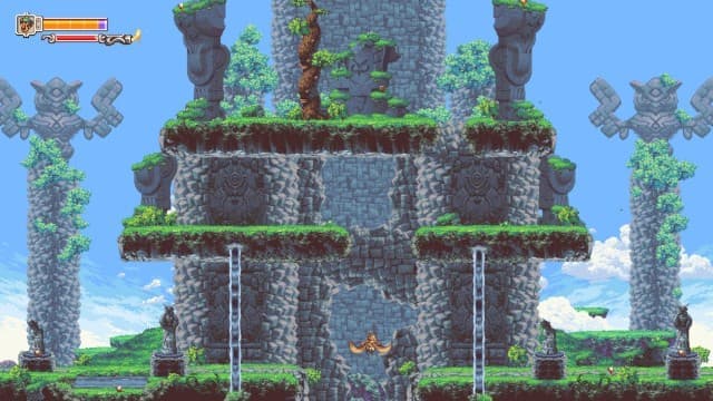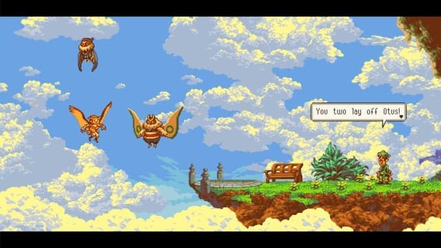 Проект примечателен не только сюжетом и внешним видом, но и необычными составляющими механики. Отус умеет летать и сколь угодно долго парить в воздухе. Он без труда изучает окрестности и пробирается в древние храмы. Впрочем, мобильность остается единственным козырем протагониста. Кроме этого, в его распоряжении есть лишь удар, отправляющий противников в нокаут. Не самый внушительный список способностей.