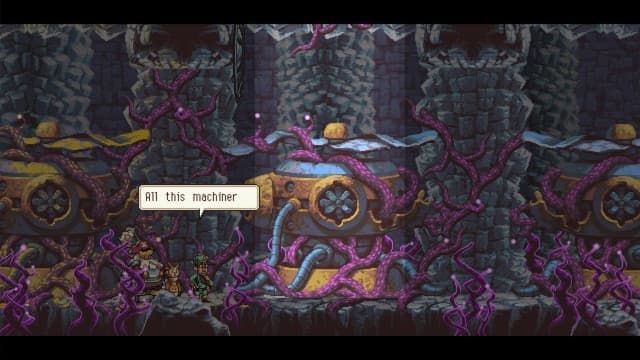 При всей сказочности антуража Owlboy не чурается драматичных сцен, а конфликт со здешними пиратами развивается по не самому благоприятному сценарию. В сюжете переплетаются воедино многоходовые планы таинственных личностей, массовые убийства и древние цивилизации. Эта добродушная с виду вселенная скрывает жестокие тайны о вышедших из-под контроля экспериментах и происхождении боевых роботов. С нетерпением ожидаешь очередного рассказа или сюрприза, коих предостаточно.