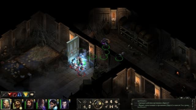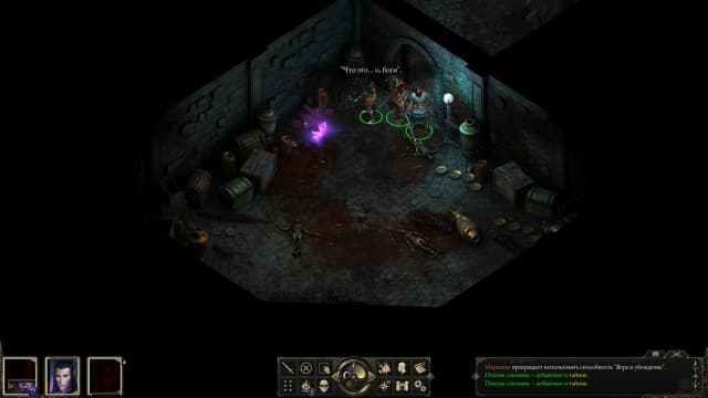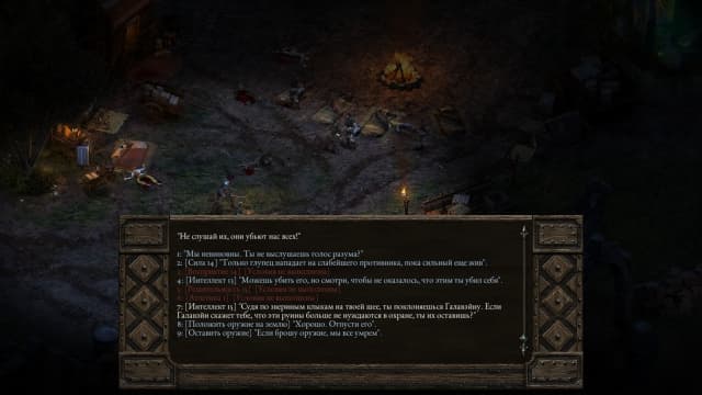Диалоговая система в Pillars of Eternity — одна из самых продуманных и сложных. Вариантов ответов много, собеседники не стесняются взрываться эмоциональными, длинными рассказами. Каждый параметр героя важен, и если он прокачан до требуемого уровня, то открываются новые реплики, способные запросто унять спор или остановить убийство. Собственно, некоторых боссов можно просто уговорить сдаться или, в крайнем случае, напугать их приспешников.
