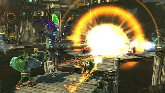 Поскольку герои теперь действуют везде и всегда вместе, то об исследовании Млечного пути, свободном путешествии от планеты к планете и поисках секретов лучше не вспоминать. All 4 One представляет собой классическое линейное приключение с последовательностью уровней. Оно, в общем-то, и правильно. В кооперативных забавах необходимо постоянно давить на команду, ставить её в самые неожиданные условия и заставлять героев вместе выпутываться из ловушек. С этой задачей проект справляется.Несмотря на то, что новоиспечённый отряд спасителей состоит из разных существ, возможности их во многом идентичны. У каждого есть свои секреты, но большую часть времени они полагаются на общедоступные устройства и умения. Все члены команды умеют обращаться с оружием, совершают двойные прыжки, цепляются энергетическими хлыстами за висящие в воздухе шарики и преодолевают бездонные пропасти. Сложная платформерная составляющая, как и поиск путей в хитросплетениях инопланетных конструкций не нашли своего места в новом приключении. Зато других занятий в избытке.Отважная команда расправляется с толпами роботизированных созданий и скачет по кочкам дружным лягушачьим квартетом. Вот герои уже мчатся по монорельсу и уворачиваются от мин и огненных ловушек. В определенные моменты игра превращается в двухмерный скроллер: персонажи хватают реактивные ранцы и летят вверх или вниз, попутно избегая смертоносных шестерёнок и лазеров.Хватает и ситуаций, где приходится распределять обязанности. Один тащит ценный предмет, другой защищает товарища от назойливых хищников, а третий отвечает за подзарядку груза. Присутствует управление стационарными орудиями, заплывы по опасным водам и даже сёрфинг.