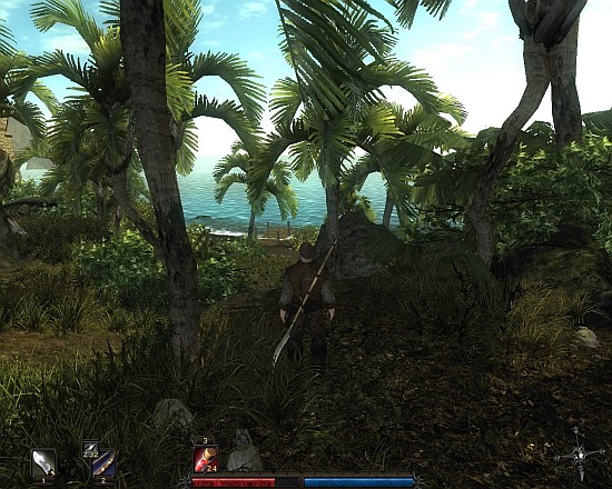 Но не печальтесь – у вас есть друзья! Точнее, друг. Один, но стоит многих, скелет по имени Фред. Когда найдёте первый свиток с вызовом, тут же применяйте, и оставшееся время вашей главной заботой будет следить за состоянием здоровья верного телохранителя. Фредди не особо силён, не слишком бронирован, но он может отвлекать врагов на себя, а нам только этого и надо! Ещё ни один элитный ящер не научился блокировать удары хвостом, так что Фреда вперёд – пускай принимает удары на себя, а мы неторопливо и со вкусом будем по одному сравнивать счёт. А потом можно и похохотать зловеще, стоя над поверженными. Главное, используйте недокументированную «фишку»: при каждой загрузке здоровье скелета восстанавливается до максимума. Оружием вас игра также не будет баловать. Хлам, которым сражаются скелеты и карлики, не заслуживает внимания. Первые серьёзные образцы вы выкуете собственными руками, но они потребует от вас знания, с какой стороны браться за кузнечный молот и как не отбить себе пальцы при этом. Те же навыки позволят вам восстановить два редких меча: Бурезов и Пьющий Души. Мечи красивые и достаточно мощные, особенно для первой главы. К сожалению, несмотря на название, Пьющий Души не восстановит вамздоровье, а Бурезов не обрушит гнев небес на непокорных. В игре вообще нет магического оружия.Но не в мордобое счастье. То есть, конечно же, в мордобое, но не только в нём. Для начала, избавьтесь от всех иллюзий, в том числе и от той, что остров маленький. Он в ширину небольшой, но вы про высоту не забывайте. На плато вы наткнётесь на стаю грифов, под ним обнаружится вход в пещеру. Проплутав часик по ней, выйдете к уже знакомым местам, но взглянете на них с такого ракурса, о котором раньше и не подозревали. Бредя по пояс в соленой воде, неожиданно наткнётесь на скрытый засохшими водорослями провал, за которым два полуистлевших воина охраняют сундук с фрагментом уникального меча. Вместе со случайным напарником прорвётесь сквозь целую армию карлов, будете долго спускаться по разрушенному проходу в мрачные глубины, и только неровный свет факела будет освещать ваш путь. А там, стоя над хладным трупом легендарного монстра, посмотрите на будильник и с удивлением обнаружите, что через два часа пора вставать. Именно за эти ощущения авторов хочется расцеловать в небритые щёки, усадить за стол и долго пить с ними алкогольные и не очень напитки, вспоминая игры настоящего и прошлого. А за боевую систему подсыпать в то же вино снотворное со слабительным.