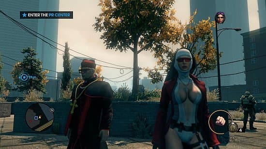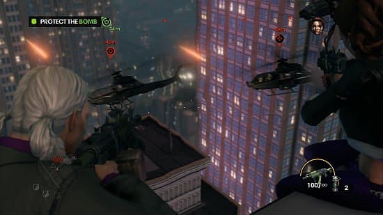 Враги подъезжают к месту сражения со всех возможных направлений и без зазрения совести материализуются из воздуха. Мозгов у них немного, но их количество с лихвой компенсирует этот недостаток. Легких побед тут нет. Рядовым дуболомам помогают меткие снайперы, живучие здоровяки и закованные в броню пулемётчики. Битвы с боссами не просто обставлены с подобающей помпой, но и вынуждают использовать все хитрости в очерченных рамках.Показатель «Уважения» вместо пропуска к следующим этапам занял место системы развития. За все поступки, от опасного вождения до выполнения важных поручений, герой становится более уважаемым человеком, получает новый уровень, а с ним и доступ к полезным навыкам, коих тут превеликое множество. Увеличить запас здоровья или ускорить регенерацию, усилить свою банду, выдать товарищам оружие получше, установить нитро-ускорители на автомобилях, научиться стрелять сразу из двух рук и так далее. Чем выше уровень, тем больше открывается способностей и тем больше денег расходуется на их приобретение. Поэтому скупка недвижимости и прочие пути увеличении дохода в Saints Row: The Third играют значимую роль.Заметно расширился и арсенал. К повседневным автоматам добавились радиоуправляемые дроны, ультразвуковая пушка и прочие игрушки из недалекого будущего. Вооружение тоже дозволено усовершенствовать. Последняя стадия апгрейда открывает новые возможности для старого оружия. К примеру, пистолет стреляет разрывными пулями. Ещё один повод расстаться с кругленькой суммой вечнозеленой валюты.Обидно, но напарники, сопровождающие героя, за прошедшие годы не поумнели. Они по-прежнему застревают на месте или лезут в самое пекло, глупо умирают или не оказывают поддержки. Только успевай воскрешать этих растяп. К счастью, все миссии сюжетной кампании можно пройти вместе с живым человеком. Никто не запрещает каждому из игроков свободно шататься по городу или выяснять отношения в соревновательном режиме «кошки-мышки». В последнем случае один участник должен проехать на машине через контрольные точки, а второй – уничтожить беглеца, находясь за штурвалом боевого вертолёта.